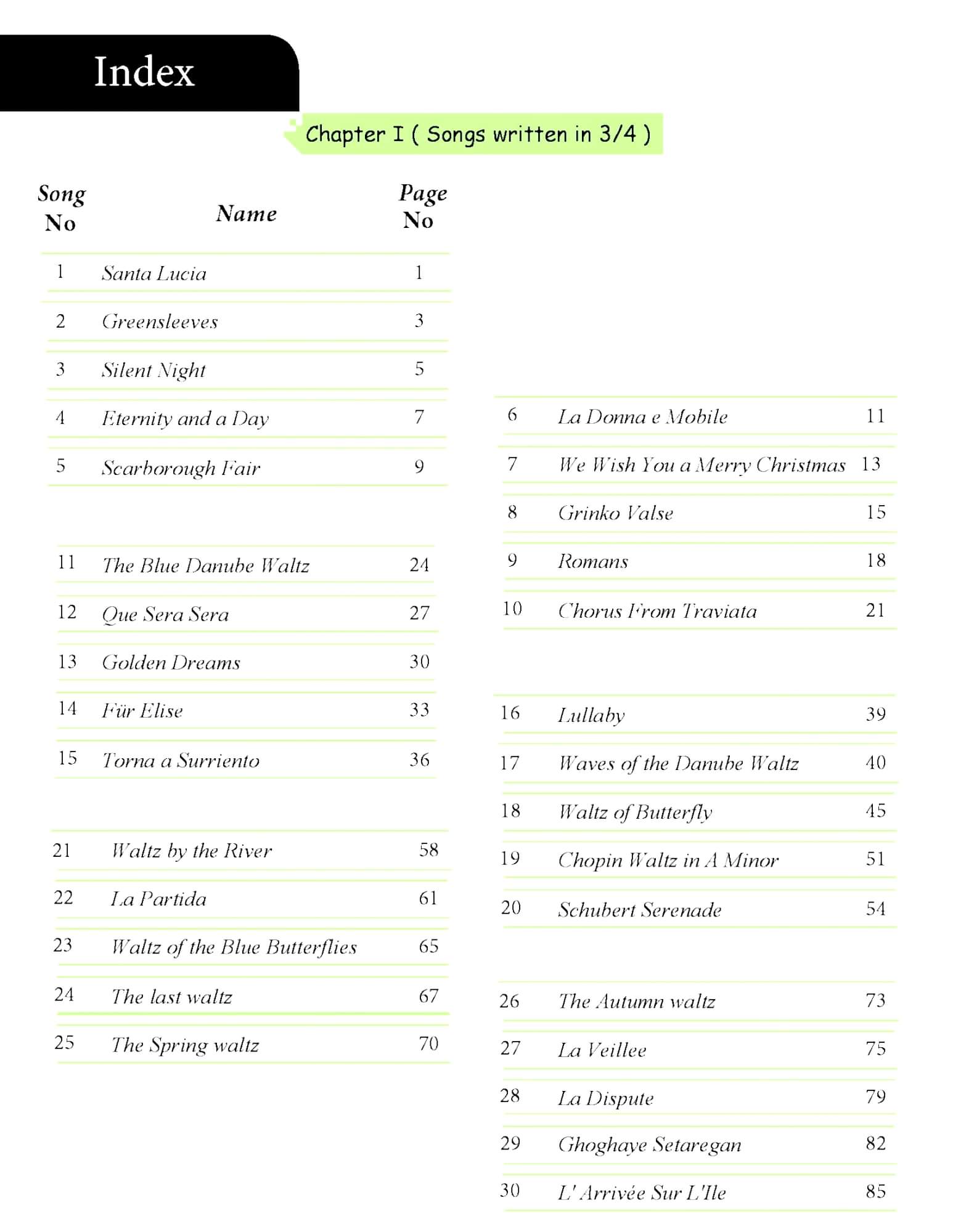 Santa Lucia , Greensleeves , Silent Night , Eternity and a Day , Scarborough Fair , La Donna e Mobile , Romans , Grinko Valse , Chorus From Traviata , Waltz by the River , Waltz of the Blue Butterflies , Schubert Serenade , Chopin Waltz in A Minor , Waltz of Butterfly , L' Arrivée Sur L'Ile gibi örnekler yer almaktadır.