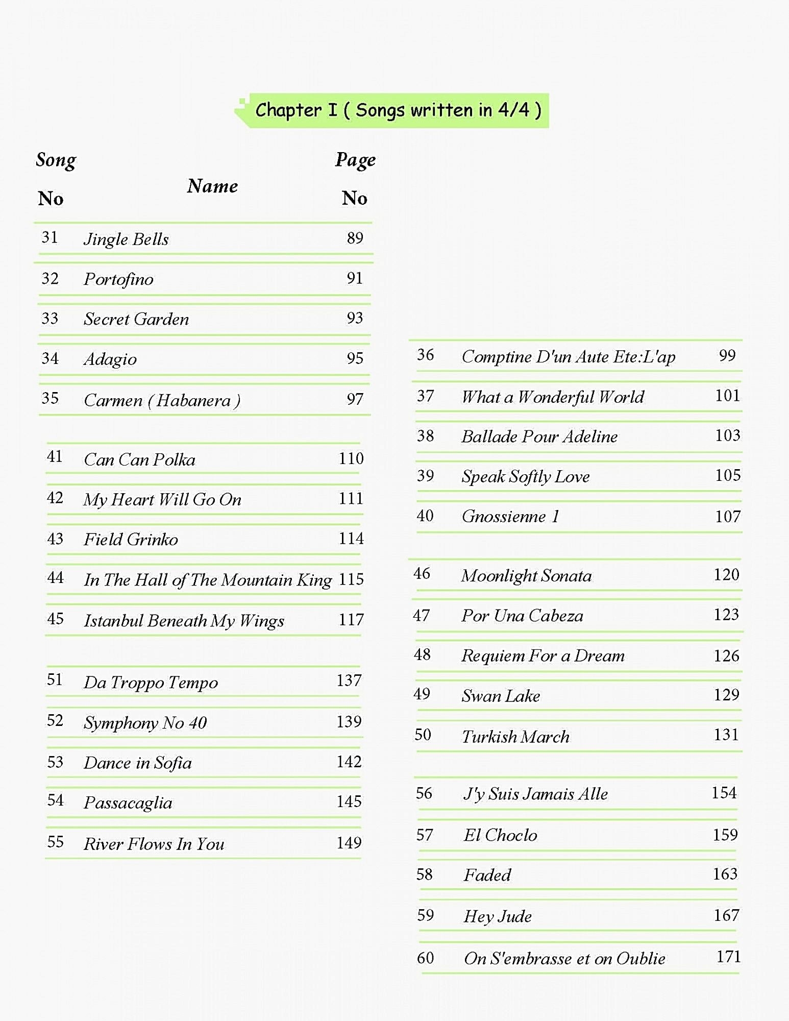 Jingle Bells, Portofino, Secret Garden, Carmen ( Habanera ), My Heart Will Go On, Field Grinko, In The Hall of The Mountain King 115, Istanbul Beneath My Wings, Comptine D'un Aute Ete:L'ap, What a Wonderful World, Ballade Pour Adeline, Speak Softly Love, Gnossienne 1, Moonlight Sonata, Por Una Cabeza, Dance in Sofia, Passacaglia, River Flows In You, J'y Suis Jamais Alle gibi örnekler yer almaktadır.
