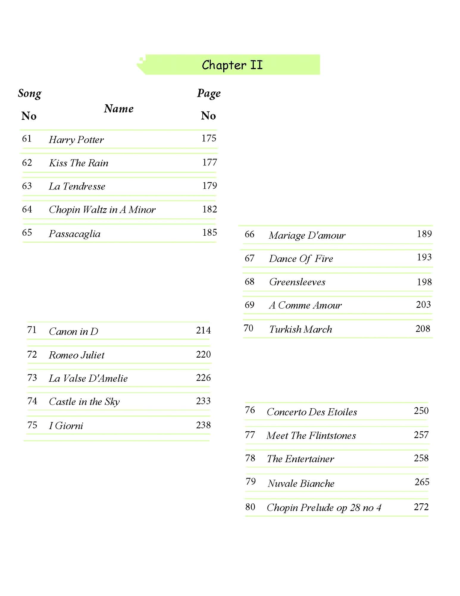 Harry Potter, Kiss The Rain, La Tendresse, Chopin Waltz in A Minor, Passacaglia, Mariage D'amour, Dance Of Fire, Canon in D, La Valse D'Amelie, Castle in the Sky, Concerto Des Etoiles, Meet The Flintstones, The Entertainer, Nuvale Bianche, Chopin Prelude op 28 no 4, I Giorni gibi örnekler yer almaktadır.